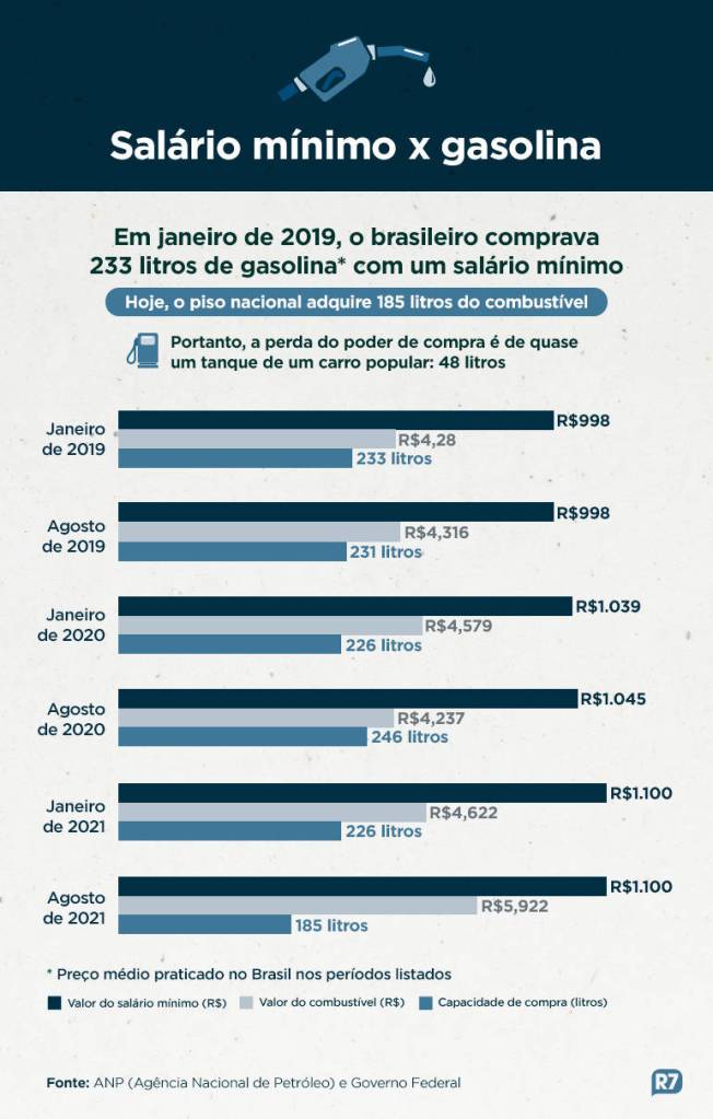 Em janeiro de 2019, primeiro mês do atual governo, era possível comprar, no preço médio aferido pela ANP (Agência Nacional do Petróleo, Gás Natural e Biocombustíveis), 233,8 litros de gasolina comum com o piso nacional, na época em R$ 998. Trinta e dois meses depois, em agosto de 2021, com os atuais R$ 1.100 só é possível adquirir 185,7 litros .