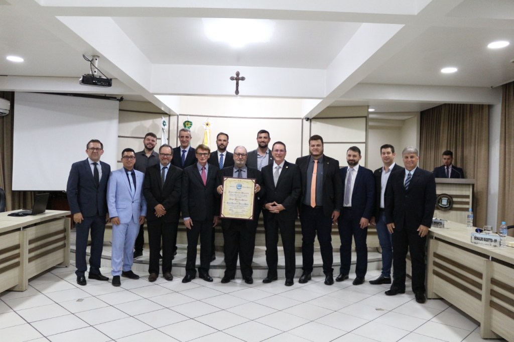 Com o plenário lotado, na última segunda-feira, 07/11, a Câmara de Vereadores de Francisco Beltrão fez a entrega do título de Cidadão Honorário do município à Sérgio Vitalino Galvão, que completou 70 anos de idade na mesma data. A homenagem é um reconhecimento aos relevantes serviços prestados à comunidade beltronense, por sua dedicação à atividade política e social no município durante as últimas décadas.