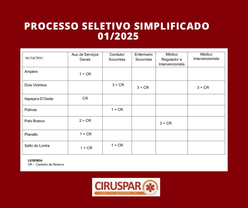 Estão abertas as inscrições para o Processo Seletivo Simplificado (PSS) do Serviço de Atendimento Móvel de Urgência (Samu) na região Sudoeste (Ciruspar). As vagas são destinadas a diferentes áreas, com oportunidades para os seguintes cargos: auxiliar de serviços gerais, condutor socorrista, enfermeiro socorrista, médico regulador e intervencionista.